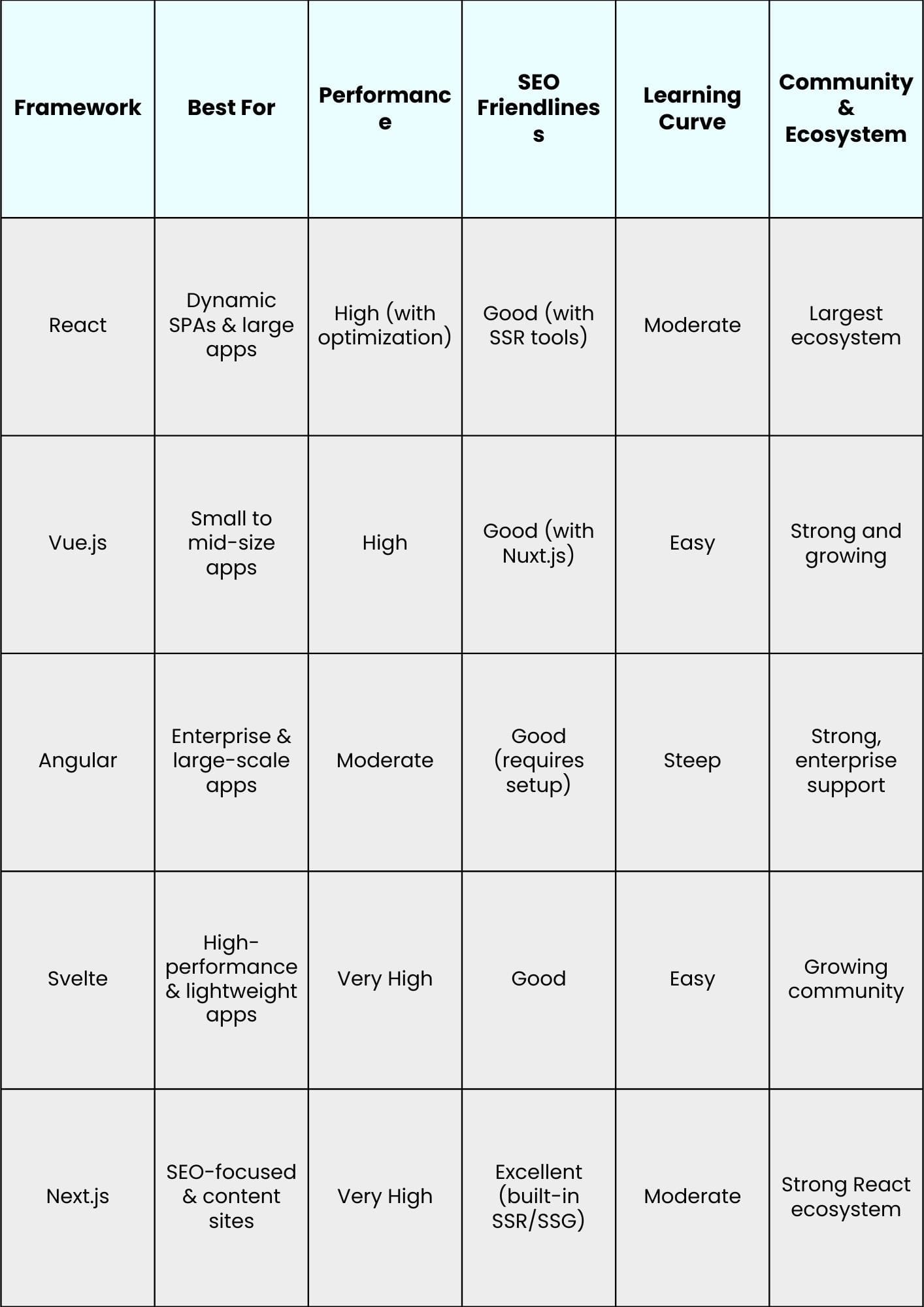 - Choose frameworks with SSR/SSG support for better SEO.