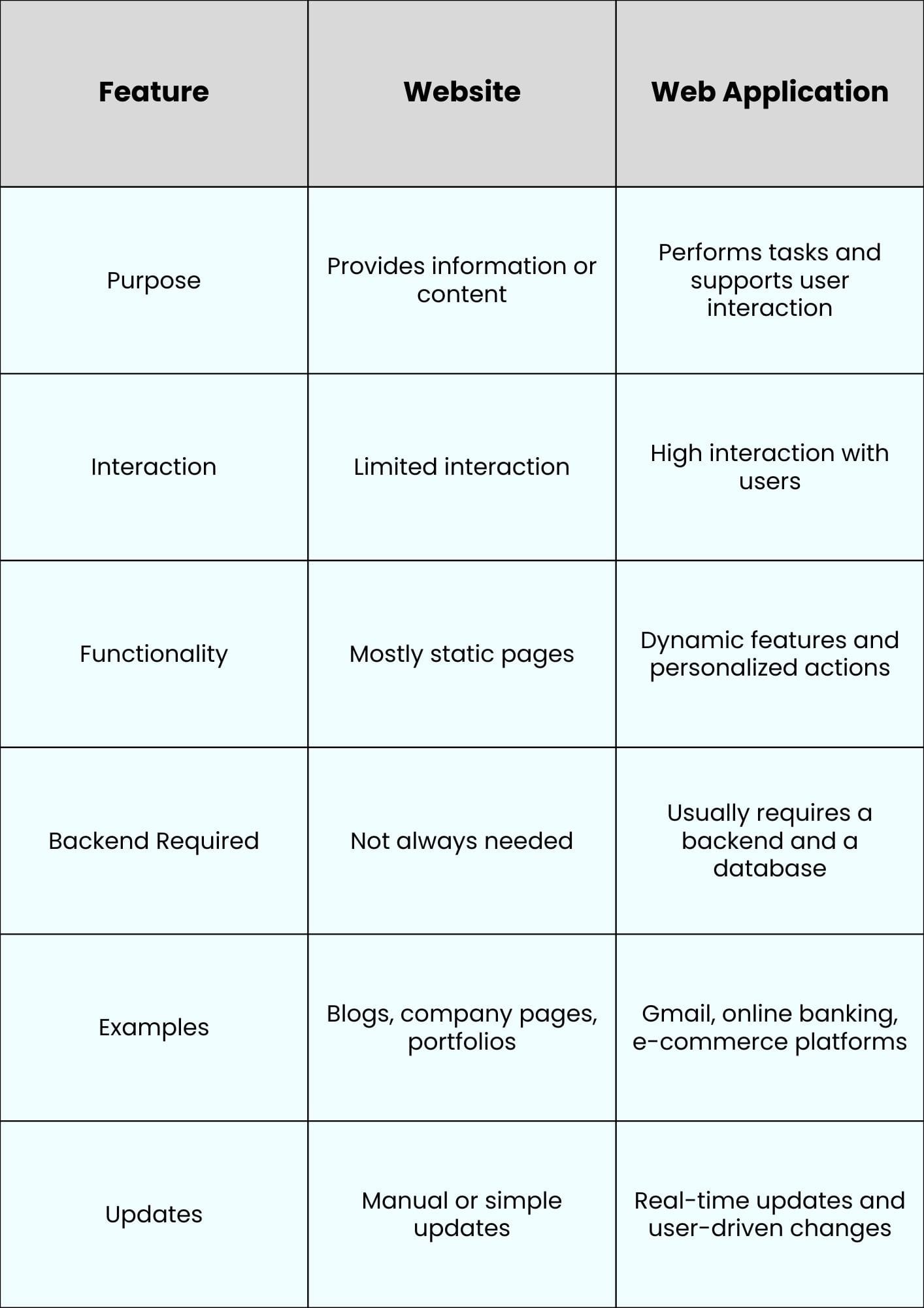 A website is a collection of web pages that mainly share information, like blogs or company profiles. A web application is a software program accessed through a browser, designed for interaction and tasks, like email or online banking. While websites focus on content delivery, web apps focus on user actions and real-time functionality.